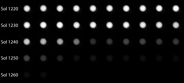Over the weekend I fiddled with the "tau" images that Mars Exploration Rover Pancam lead Jim Bell gave me, and I produced a couple of different ways to visualize the darkness of the rovers' skies. Typically, the rovers turn to find the Sun, cover their Pancam eyes with dark solar filters (like welders' glasses), and take photos, several times a day. These photos, when calibrated, provide a direct measurement of how much sunlight is getting through Mars' atmosphere to the rovers. The opacity of the atmosphere is referred to by the Greek letter tau (τ). Atmospheric opacity increases exponentially with increasing tau. So here are two animations, one for Spirit and one for Opportunity, covering pretty much the same time period. Opportunity's skies get darker faster than Spirit's skies do, and the opacity is also more variable. Spirit now has skies as dark as Opportunity's. For several sols, Opportunity wasn't able to muster enough power to take any tau measurements at all, so I substituted in images with an "X" to indicate that.