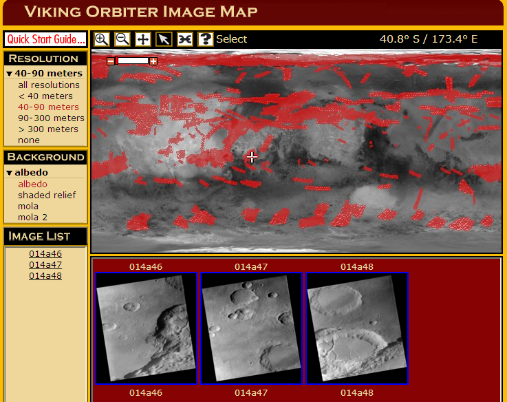 Arizona State University provides graphical and forms-based tools for locating data from the Viking orbiters, Mars Global Surveyor MOC, Mars Odyssey THEMIS, and Mars Reconnaissance Orbiter CTX and HiRISE cameras. This screen cap shows the map interface to high-resolution Viking orbiter imagery. The "Image list" at lower left and thumbnails at bottom show all Viking orbiter images with resolutions between 40 and 90 meters per pixel that overlap the point at the crosshair.Blog Search