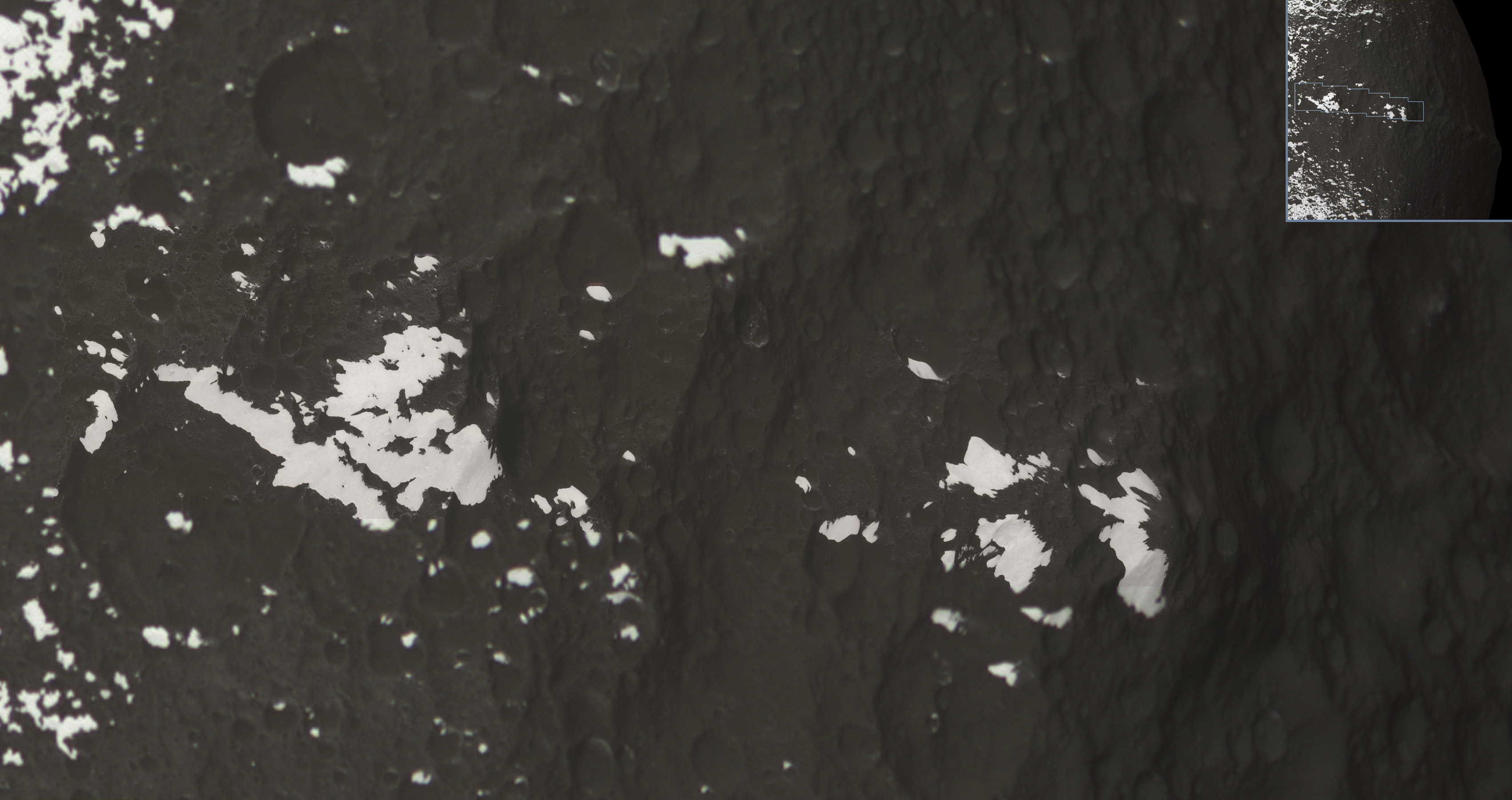 Just after its closest approach to Iapetus on September 10, 2007, Cassini focused downward to capture a six-frame color mosaic of the "Voyager Mountains," a line of peaks first spotted in images from the Voyager spacecraft as a series of white spots marching along the equator into the dark terrain. The data was released to the Planetary Data System in June 2008; here, amateur Gordan Ugarkovic has assembled the mosaic, in color, and overlaid it on a wide-angle shot taken at the same time to provide context. The color is slightly different between the narrow- and wide-angle mosaics: narrow-angle is IR1-GRN-UV3, while wide-angle is IR1-GRN-VIO. The mosaic is shown here at half its full resolution; visit Ugarkovic's Flickr photostream to download the full-resolution version.Blog Search