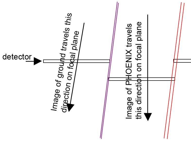 But Phoenix was moving, and it was moving in not quite the same direction that the surface of Mars appeared to be moving. The point of the image was to capture a view of Phoenix, so the Mars Reconnaissance Orbiter team set up a slew -- a rotation of the spacecraft -- that was precisely timed to compensate for the motion of Phoenix. As the orbiter traveled along in its orbit and Phoenix fell to the ground the spacecraft rotated in such a way that, from the camera's point of view, Phoenix appeared to travel perpendicular to the orientation of the HiRISE detectors -- that is, it made the image of Phoenix build up in a way that was the way the HiRISE team designed their camera to capture images. So they got a really nice image of the lander. However, when they followed Phoenix, they allowed the ground to drift at an angle across the CCDs. Here's a cartoon Timothy sent me that shows what I'm talking about: