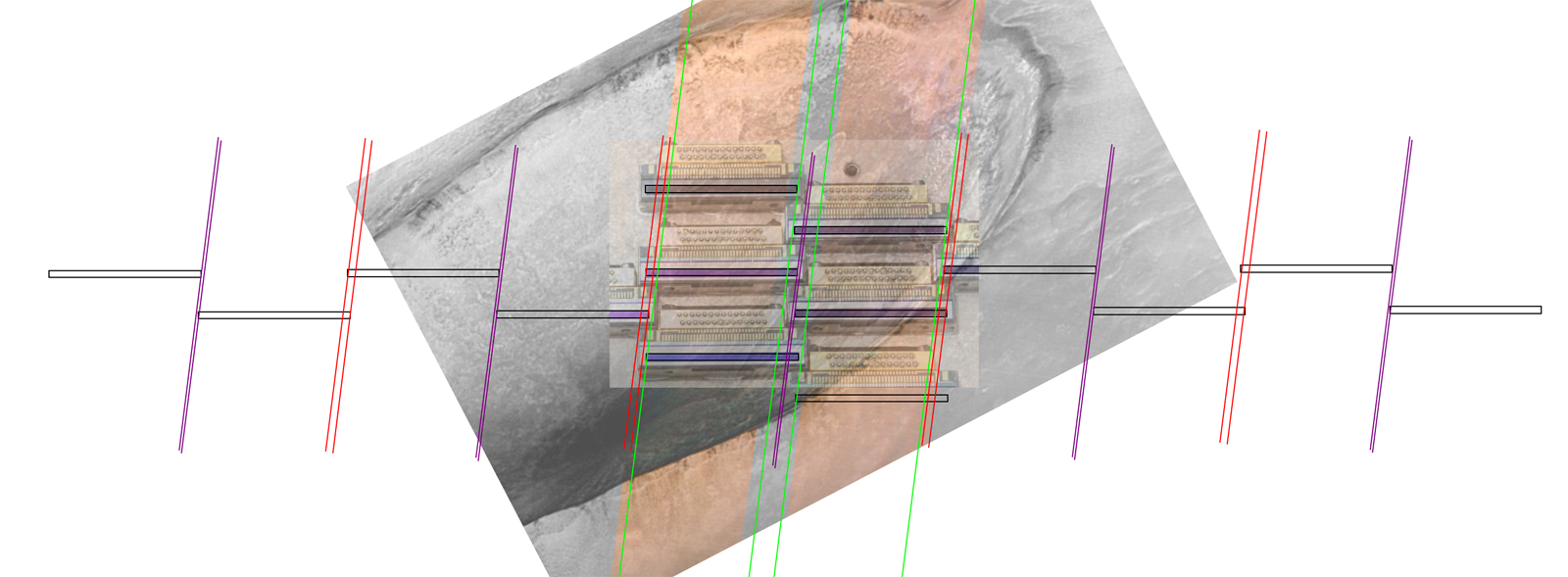 As Mars Reconnaissance Orbiter slewed to make Phoenix travel perpendicular to the HiRISE detectors, the surface of Mars drifted at an angle through the HiRISE field of view. The combination of the angular drift and the staggered positions of HiRISE's 14 detectors resulted in gaps in the final image.Key: Black rectangles show approximate locations of HiRISE chip assembly active areas overlaid onto a photo of the central group of six chips. Purple lines show where the angle of the ground image travel across the focal plane causes a gap in the overlap for the red (monochromatic) channel. Red lines show where the angle of the ground image travel across the focal plane causes a larger than normal overlap for the red channel. Green lines indicate the boundaries within which color data is available, where portions of image swaths reach all three color channels.All of this developed after my initial conversation with Timothy, in which I asked him to explain another detail about HiRISE, the fact that it uses Time-Delay Integration to build up its images. Time-Delay Integration is an important feature of many (in fact, most) pushbroom cameras in space, including not just Mars cameras but also the MVIC instrument on New Horizons, but until Timothy explained it to me I could not make myself understand what it was. Below is Timothy's explanation, which cleared things up for me -- I hope it helps you as well.