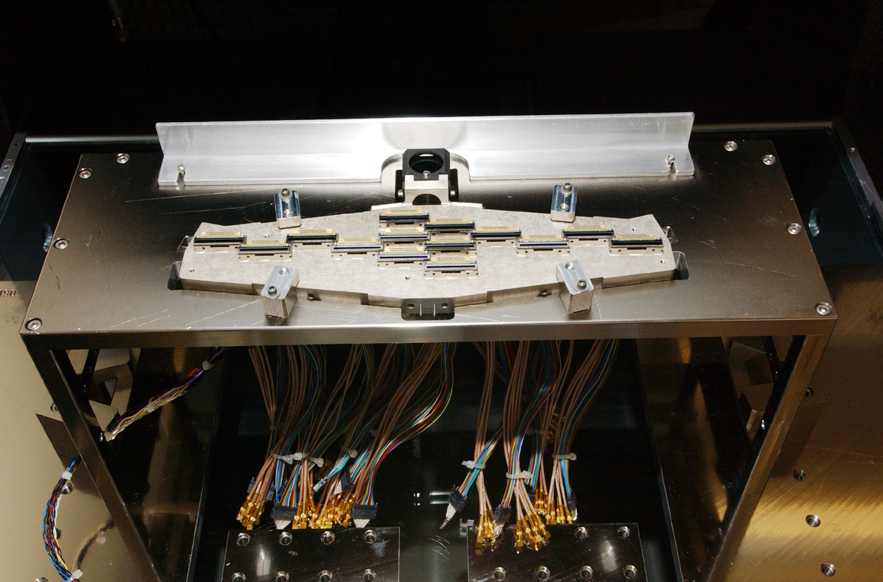 The HiRISE camera has 14 detectors, lined up on a large focal plane. Ten of the detectors see red wavelengths and form a staggered line that allow HiRISE to capture grayscale images 20,000 pixels across. At the middle of the focal plane are two more pairs of detectors that see blue-green and infrared light, allowing the HiRISE team to show the center 20% of any image swath in color.At this point in the HiRISE assembly the detector elements are bare but are correctly aligned, set to the same height, and measured so that the locations of the pixels is known to an accuracy of a few microns. Later a metal cover was installed that had spectral filters, sharp-edged rectangular apertures, and stray light baffling.