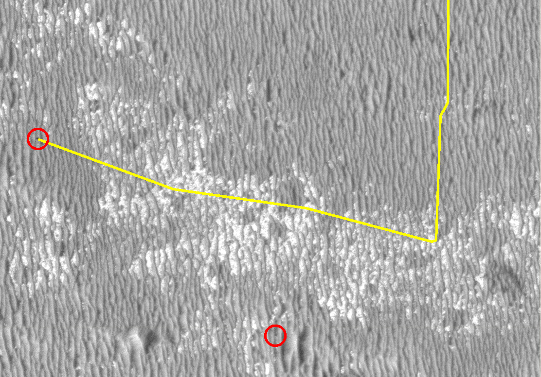I really can't explain why it didn't occur to me to search for the rover in the image of Victoria crater released by the HiRISE team on Wednesday. Actually, now that I reflect on it, I can; the press release about the photo of the crater hit my mailbox five minutes before I had to leave the house for a workout class and I was racing to get the thing posted. Fortunately for me, the guys at unmannedspaceflight.com weren't in as much of a hurry, and quickly located Opportunity in the full HiRISE image. Armed with the knowledge that it was there, I figured out what sol the image was taken on (1,949), dialed up Eduardo Tesheiner's latest route map, and found it myself. It's actually remarkably easy to locate in the image -- the tracks cutting across dunes were visible at fairly low magnification.