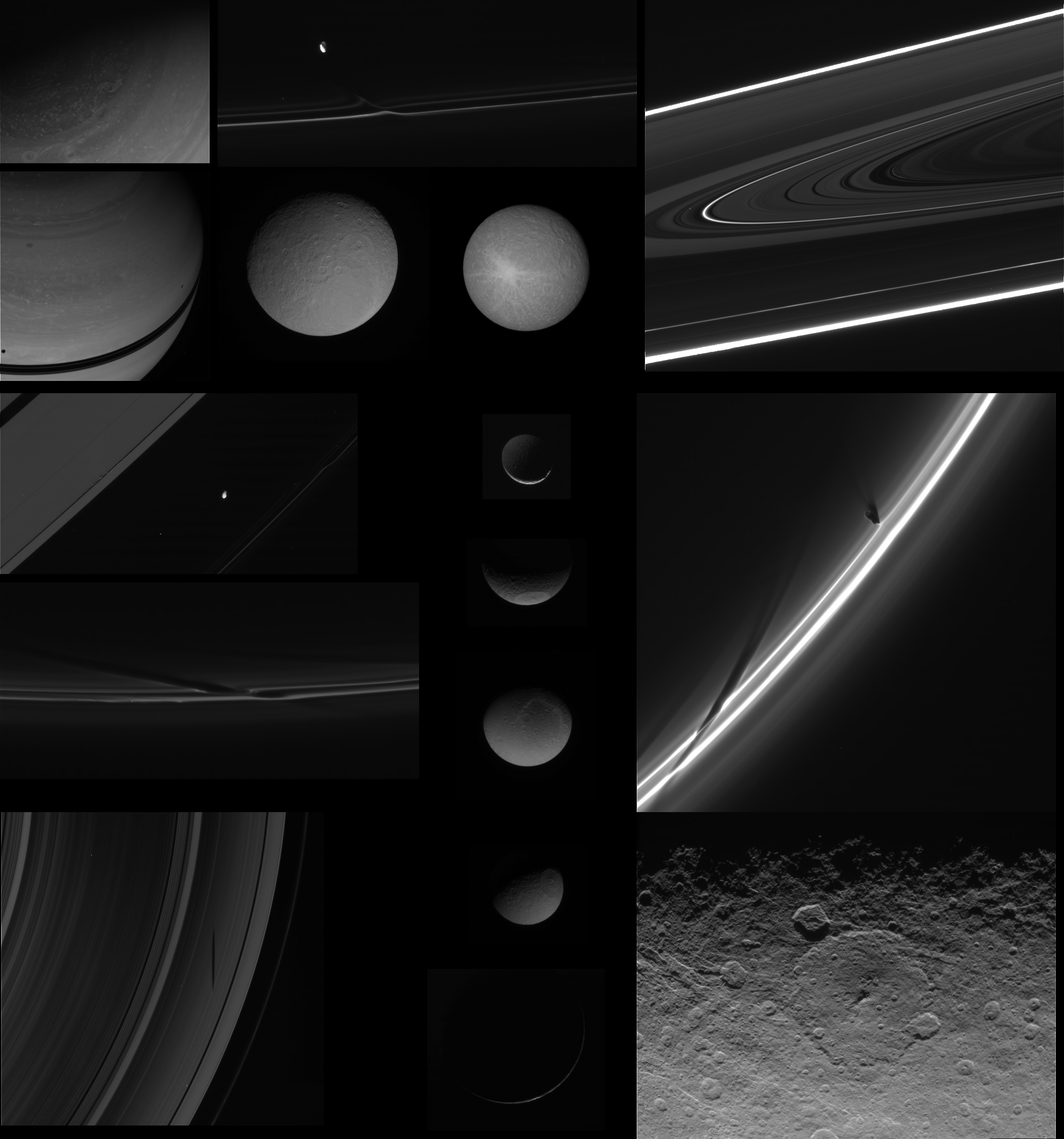 These are just a few of the nearly 10,000 images released to the Planetary Data System by the Cassini Imaging Team on January 1, 2010.Top left corner: a view down on to Saturn's north pole showing lots of storms. Immediately below that: The globe of Saturn, with the shadows of the rings compressed to three narrow bands just north of the equator. Two moon shadows appear on the globe at the same time. Top middle: Prometheus and a streamer it has just pulled from the F ring. Below that: two views of Rhea at different phase angles; the right one contains a prominently rayed crater. Top right: a view of Saturn's rings at high phase and near equinox emphasizes the F ring and a dusty lane within the Cassini division.
