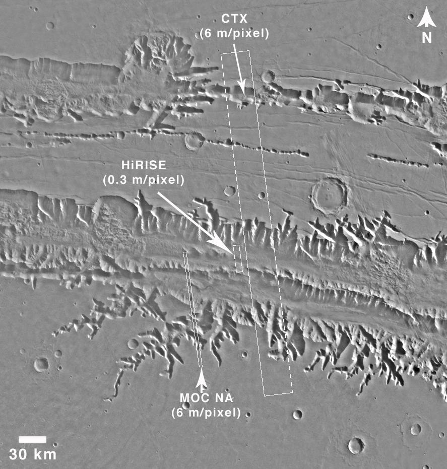 CTX, HiRISE, and MOC are three cameras that have provided high-resolution images of Mars. This diagram compares their typical footprint sizes across Ius and Tithonium Chasmae, Mars. Each camera's design makes different trades among resolution and areal extent. MOC on Mars Global Surveyor acquired long, skinny strips at about 6 meters per pixel. CTX on Mars Reconnaissance Orbiter provides images of the same resolution, but covering a much larger area. HiRISE, also on Mars Reconnaissance Orbiter, can take much higher resolution images at about 0.3 meters per pixel, but covers a proportionally smaller area. The base map to this image is the Viking Orbiter MDIM or global mosaic.CTX also monitors (that is, repeatedly images) several locations on Mars for changes or activity such as new impact craters, gully flows, dust devils, wind streaks, dune movement, and slope streaks. This monitoring has paid off, as we've found over 80 new impact sites, noticed a plethora of new slope streaks, and documented thousands of gully locations. But some of the most exciting things we've found thanks to our monitoring efforts are multiple new gully flows, first reported at the 41st Division of Planetary Sciences meeting in Puerto Rico last October.