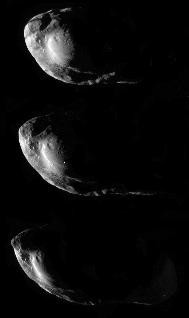 These three views of Prometheus were captured through a clear filter by Cassini's narrow-angle camera on January 27, 2010. Unlike Cassini's previous view, the more dramatic (high-phase) lighting emphasizes craters of a wide range of sizes. In the bottom image, a few details are visible in Saturnshine.But wait, what's that in the uppermost view? There's a stripe crossing Prometheus. It's even more evident in this color composite.