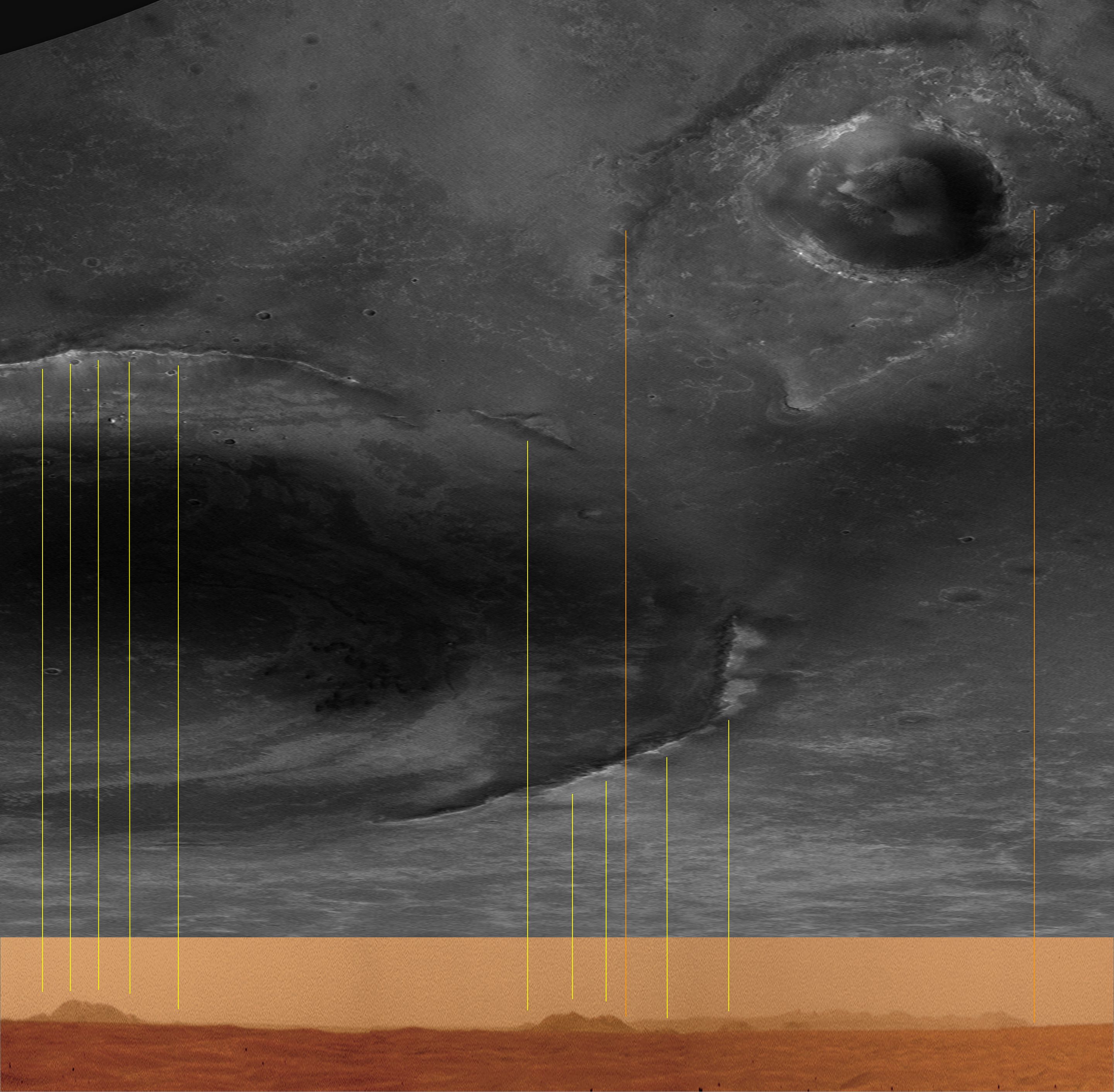 An orbital view of Opportunity's road ahead has been rotated to match the orientation of Opportunity's horizon view on sol 2,140 (January 30, 2010). The view of the horizon has been stretched vertically to exaggerate the topography. There are numerous rows of hills on the horizon, representing different portions of craters. The center set of hills is associated with the near rim of Endeavour. The leftmost set of hills is the far rim of Endeavour, and the right-side hills are the rim of another crater, Iazu.Blog Search