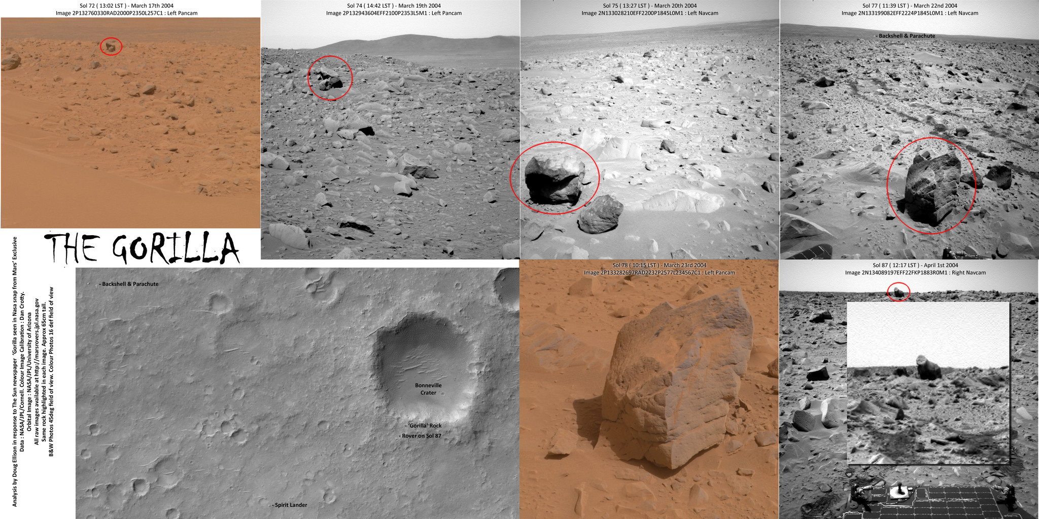 The "gorilla" turns out to be a very well-documented rock from early in Spirit's mission to Gusev Crater, Mars. (Note: the "click to enlarge" version is half the original resolution; go to unmannedspaceflight.com for the full-resolution version.)Blog Search