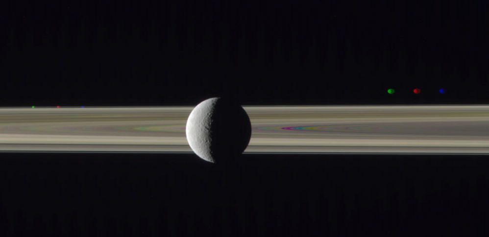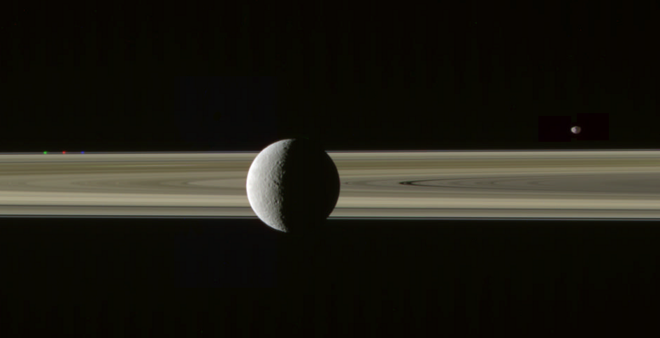 The problem, of course, is that everything in the Saturn system is in motion, including Cassini, and time passes between each of the three filtered images used to make this observation. Cassini's pointed at Rhea, keeping it in the center of the frame, but in the meantime, Cassini's perspective is shifting, causing the rings and moons to appear to move. Sometimes, you can pretend this isn't happening for the rings and you get decent color results. But there happens to be a dark gap in the rings right behind Rhea, which is visually interesting, but which causes issues with the alignment of the color channels.