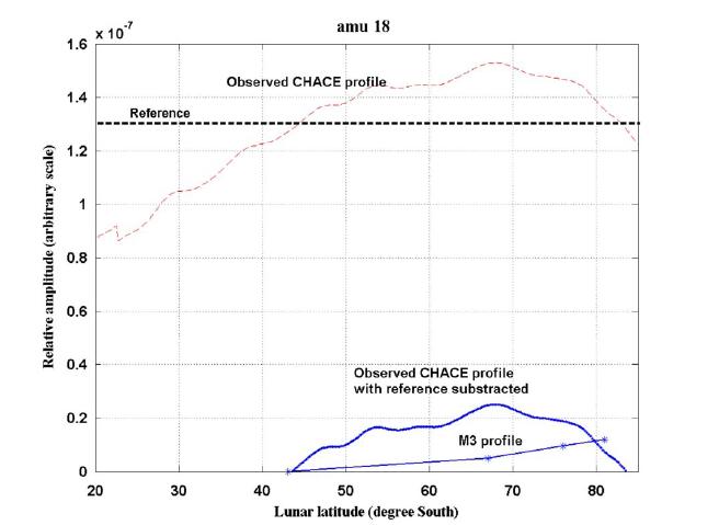 This figure depicts the latitudinal/altitudinal variation as observed by CHACE from 20 degrees south to the poles highlighting a steady increase in the H2O concentration that maximized around 60-70 degrees south latitude. The relative concentration of water-ice as detected by M3 depicting the steady increase in the concentration as one moved towards the poles. Treating the latitude of 43.1 degrees south as the reference beyond which M3 had started detecting water ice, the relative variation of H2O as seen by CHACE is also depicted highlighting the complementary nature of the measurements from CHACE and M3.What's odd is that the trend observed using CHACE is different from the trend observed using Chandrayaan-1's Moon Mineralogy Mapper (M3). M3 saw the amount of water increasing steadily toward the pole where CHACE saw it decrease. Here's how Sridharan explained that: