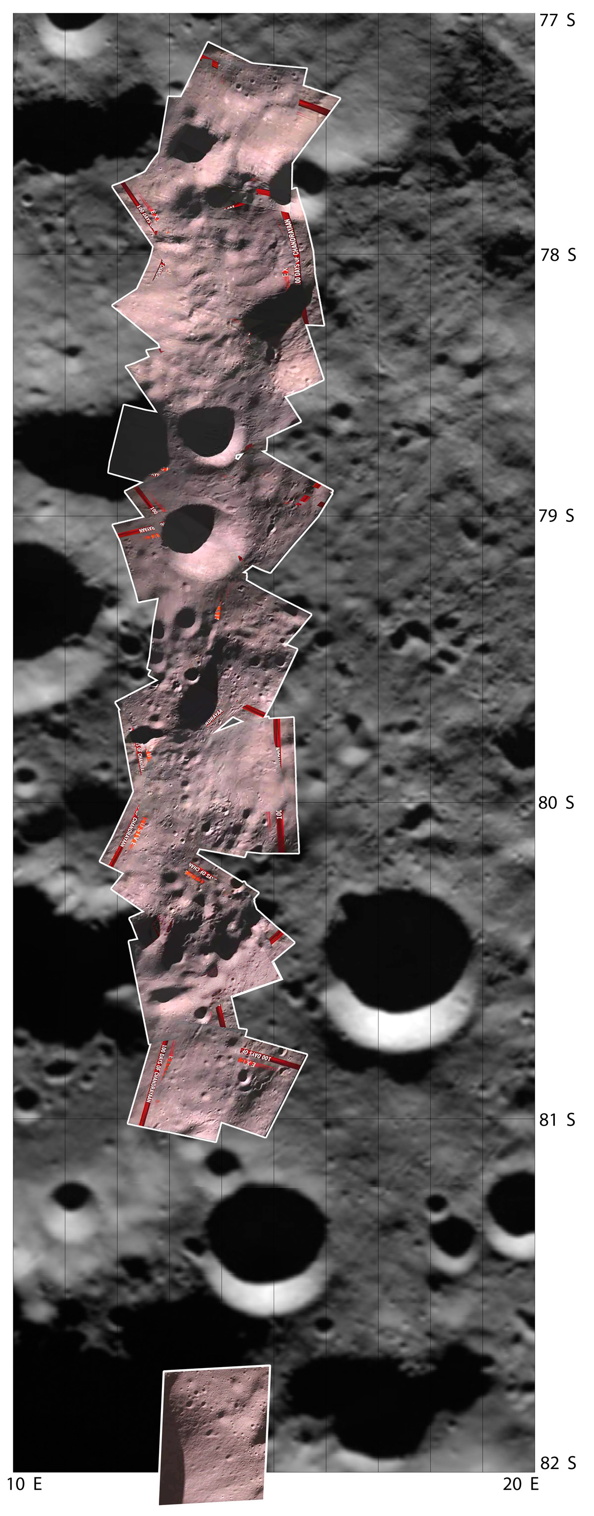 The Chandrayaan-1 Moon Impact Probe carried three instruments, one of which was a camera. Because the Probe spun as it descended, the camera images also rotated, making it something of a challenge to mosaic the images. This mosaic was created by space geographer Phil Stooke by grabbing frames from a video of descent images and overlaying them on a Clementine mosaic.