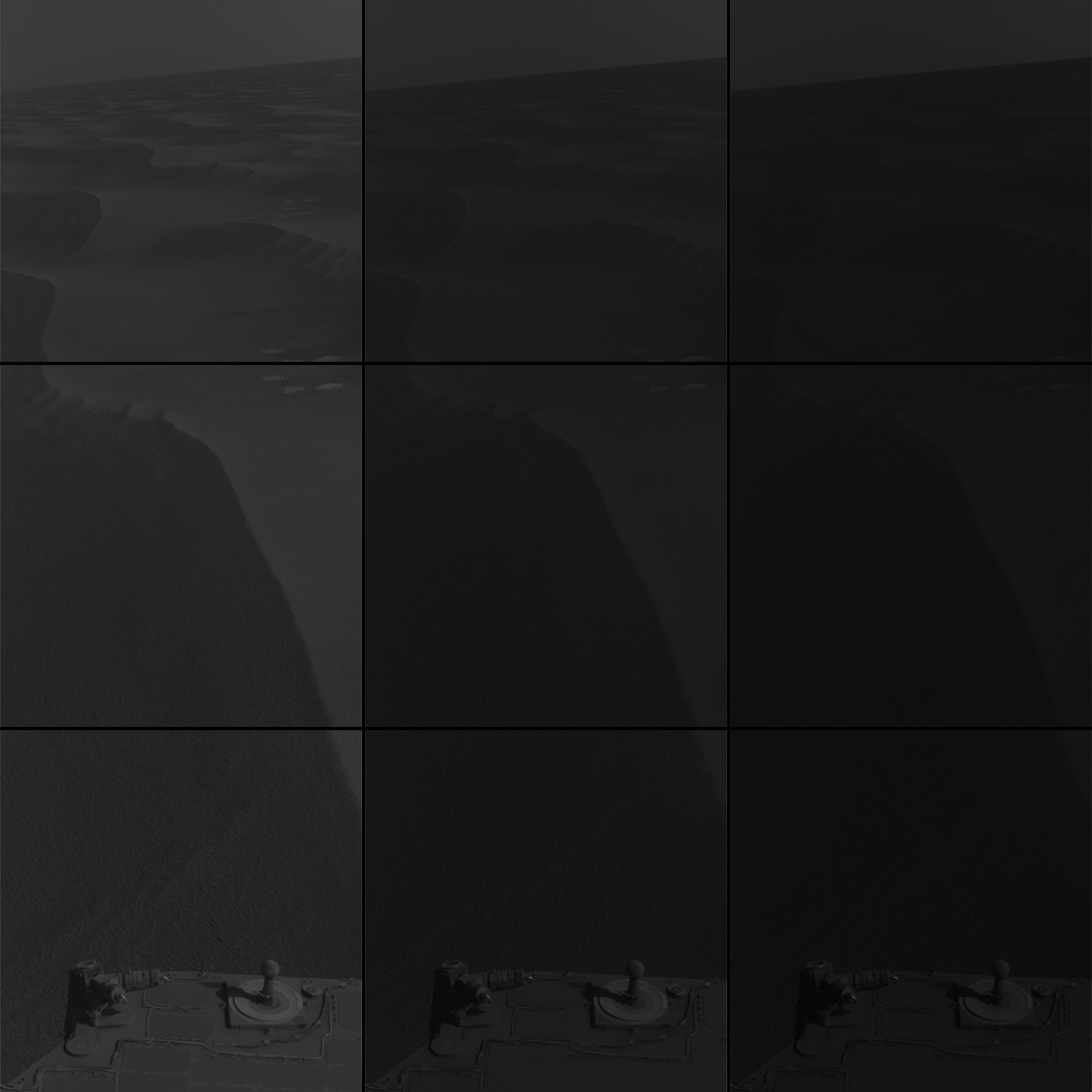 The horizon is tilted because the rover was titled, paused in the act of crossing a dune; in reality, Opportunity's horizon is extremely flat. In the foreground, Opportunity's sundial is visible. The sundial, also known as the MarsDial, is both an educational project and an important component of the camera instrument; it serves as a calibration target for the camera. When Opportunity first landed on Mars, the MarsDial's face was different shades of gray, and four different color chips occupied its corners, while its gnomon (the vertical stick) was black. After six years on the Martian surface, the whole thing is covered with a layer of dust that mutes the colors.