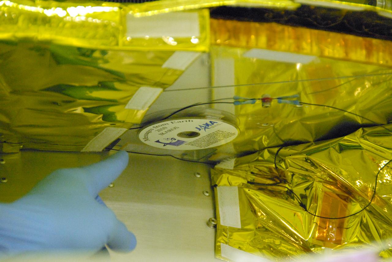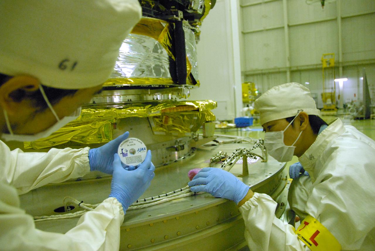 Earlier this week we received some awesome photos of the silica glass DVD provided to JAXA by The Planetary Society being mounted on the spacecraft. This all happened on April 25. If you're a member, or if you signed up on our website, your name is on this disk, and will fly past Venus with IKAROS! I especially like this photo showing the assembly and integration team (I presume) with the spacecraft and the DVD. The fellow with the blue gloves in the middle is holding the little DVD.
