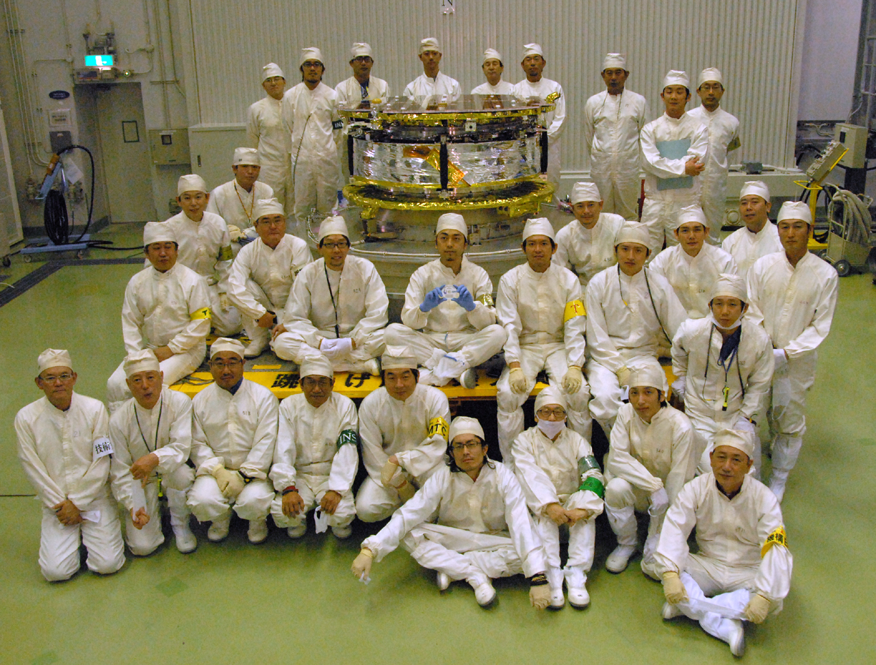 Engineers pose with JAXA's IKAROS spacecraft and The Planetary Society's DVD, which will carry more than 100,000 names toward Venus.