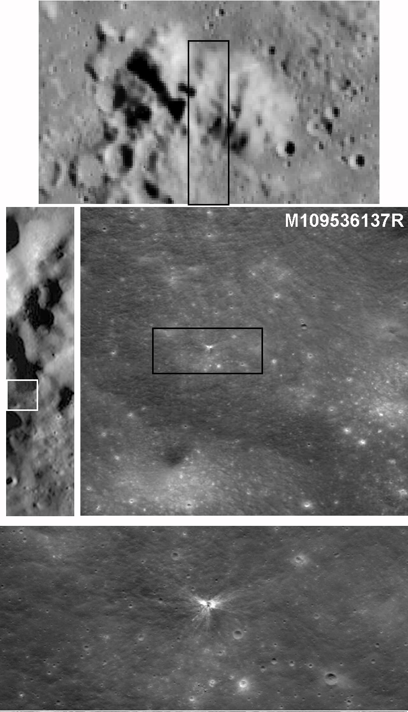 Planetary cartographer Phil Stooke tentatively identified a tiny splat visible in a Lunar Reconnaissance Orbiter image as the place where ESA's lunar orbiter SMART-1 crashed. SMART-1 was traveling from north to south, and the mission previously identified a small mountain (top image) as being the likely crash location based upon its ground track and the time of its impact (which produced a detectable flash, seen from Earth). SMART-1 hit at 33°S and 46.2°W on September 3, 2006 at 05:42 UTC. When it crashed, it did so at an exceedingly shallow angle of only about 1 degree. The resulting crater should be elongate and should have a butterfly-like spray of ejecta. Stooke looked at Lunar Reconnaissance Orbiter Camera images of the mountain, progressively zooming in from the top image, to left center, to right center, to the bottom image, identifying a bright (hence, fresh) splat as the possible impact site. This identification is far from certain; it's just a possible candidate.Blog Search