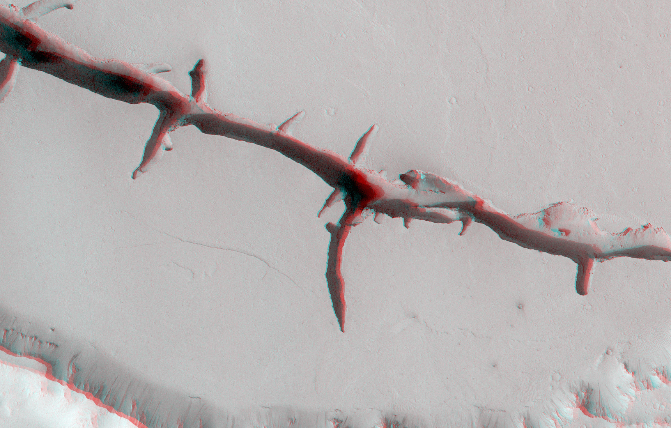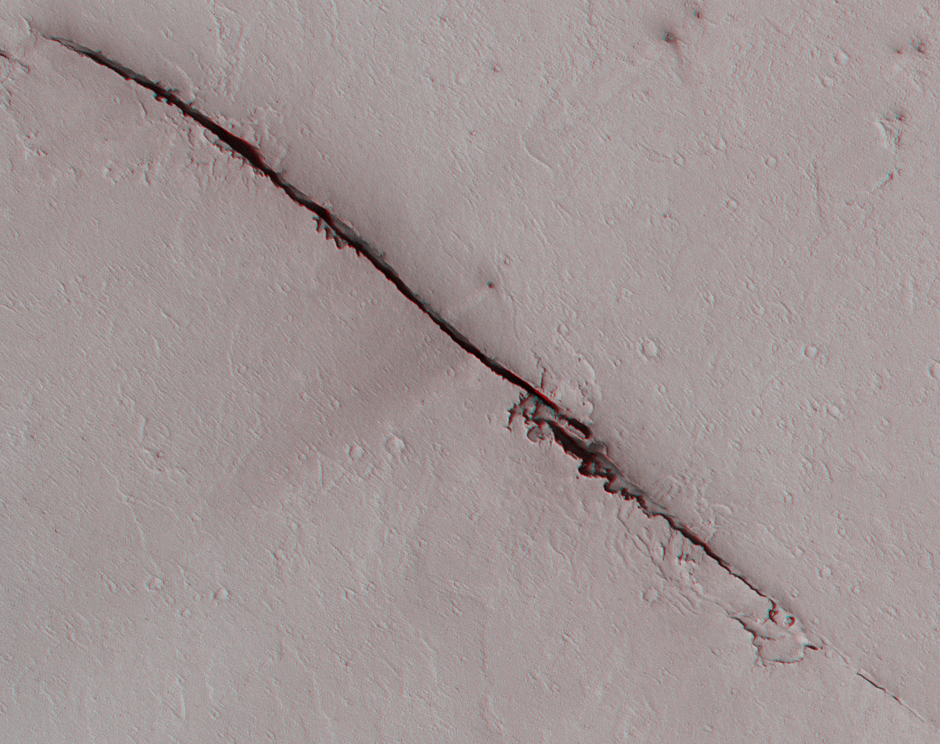 This closeup stereo view of one of the many troughs that make up the Cerberus Fossae on Mars comes from the Context Camera on Mars Reconnaissance Orbiter. Use red-blue glasses to get the 3D effect. The image is about 14 kilometers wide; the main trunk of the trough is roughly 500 meters across.The other, smaller trough, which Tanya says is a vent, looks substantially weirder. In this version of the view, I can hardly see any topographic change anywhere.