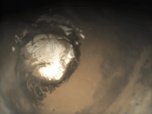 This animation is composed of 23 photos taken by the "Mars Webcam" aboard Mars Express, spanning a little more than half an hour on August 9, 2010. During the animation, Mars Express recedes from an altitude of about 4,100 kilometers to about 7,000 kilometers above the planet. The twisted canyons of Mars' north polar cap occupy the center of the view. Click here for a version at the camera's full resolution.Blog Search