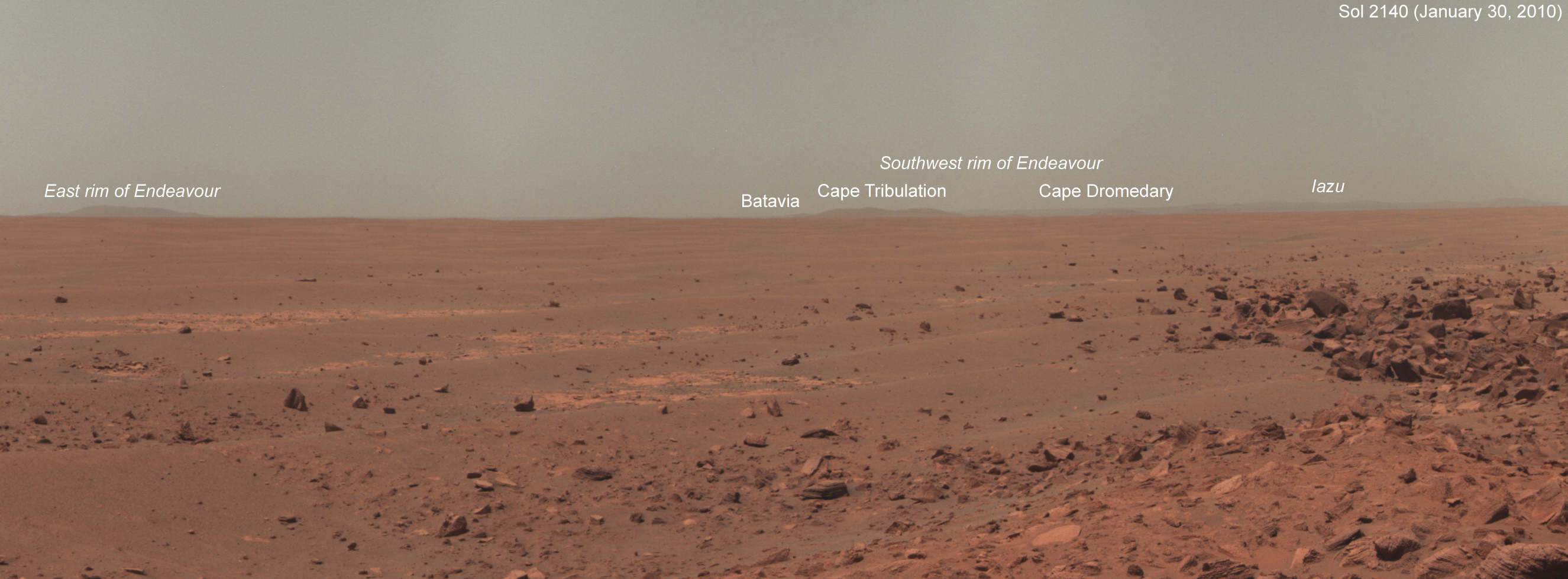 On sol 2140 (January 30, 2010), parked at the edge of Concepción crater, Opportunity got her first clear view of the rim of Endeavour crater. She is aiming toward "landfall" at Cape Tribulation, 13 kilometers away. Cape Tribulation and Cape Dromedary are both on the southwest rim of Endeavour crater, the closest part of the rim to Opportunity. The northwest rim has been eroded away. More distant hills on Endeavour's eastern rim, are much farther away than Cape Tribulation; the spot labeled "Batavia" is 30 kilometers away. Iazu is another crater beyond Endeavour, 36 kilometers away. This panorama was created from archived science data from the Planetary Data System and is composed of images captured through infrared, green, and uv/blue filters (L257).Just for comparison's sake, here is a grossly contrast-enhanced version of the view of the near-rim features in that panorama. Enhancing the contrast brings out details in the shapes of the peaks.