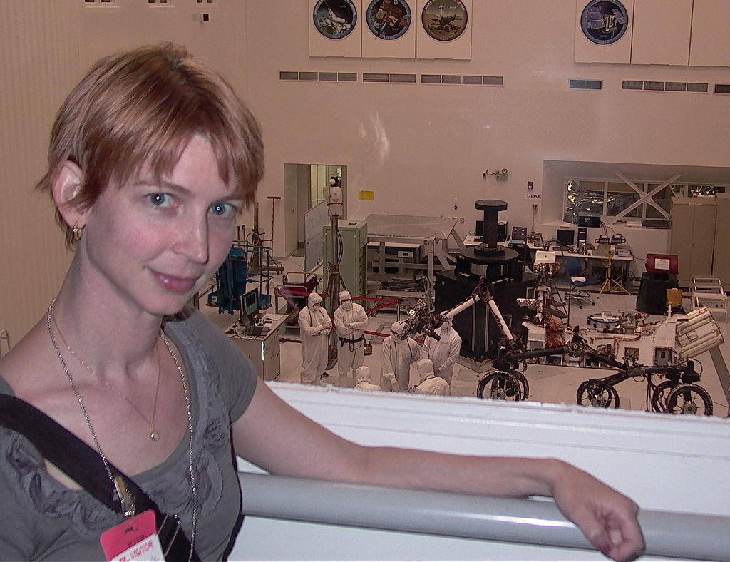 I've been itching to get back to the Jet Propulsion Laboratory to get a good look at Curiosity, the next Mars rover. (I was not excited about the name when it was first bestowed upon the rover, but, like Spirit and Opportunity, it's growing on me, and I MUCH prefer such a name to "MSL" for communicating with the public.) JPL had an event to invite the media to view the rover last Thursday, so Bill Nye, A. J. S. Rayl, and I headed up there to see how she's coming along. Here's a pic of me with the rover; JPL Tweeted a photo of Bill earlier.