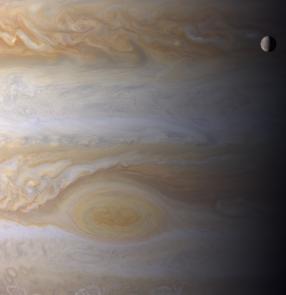 Photos like this always make me think about how unimportant size is in determining whether one of the worlds of the solar system is an exciting place. We have Jupiter, the largest of the planets and the undisputed gravitational ruler of everything in the solar system that is not the Sun. And we have Europa, the smallest of Jupiter's four main moons, much smaller than Earth, smaller even than our own Moon. Europa's smaller than many of Jupiter's storms. But even from this distance, even though it's a relatively minor participant in this photographic composition, you can see the cracked and criscrossed surface of smooth ice that makes it a fascinating world unto itself.