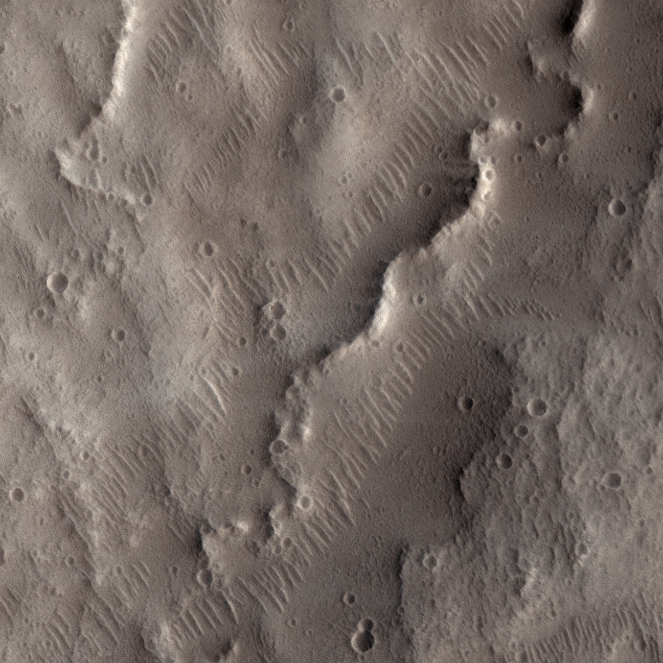 At full resolution the image is 60 centimeters per pixel; the view covers an area about 775 meters square.This HiRISE view from Tempe Terra, Mars shows esker-like ridges. Eskers are a landform common to landscapes that once bore glaciers. Meltwater running underneath the glacier erodes up into the glacier's base; over time, sediment gets deposited within this sub-glacial channel. When the glacier vanishes, a raised, sinuous ridge is left behind. They can have pretty steep sides, looking for all the world like railroad embankments. High-resolution views of Mars are showing all kinds of features that probably have glacial origins.