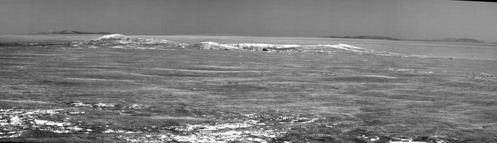 Opportunity is on a kilometers-long eastward road trip across Meridiani Planum toward the rim of a large ancient crater named Endeavour; it'll be many months yet before she gets there. But she is just about to arrive at a major landmark by the side of the road, a good place to spend a night or two (maybe even two months) before hitting the road again: a 100-meter-diameter hole in the ground named Santa Maria.