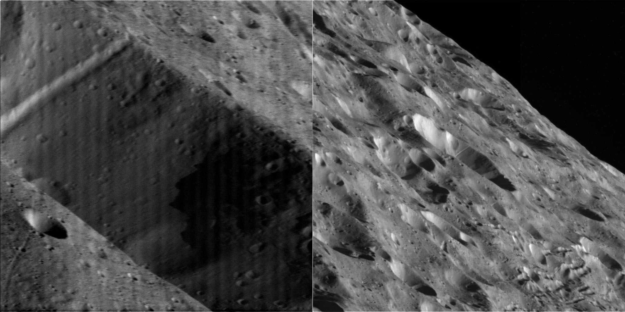 Near its closest approach to Rhea on January 11, 2011, Cassini snapped a pair of images with both cameras. The left image is with the narrow-angle camera, which has ten times the spatial resolution but only one-tenth the field of view of the wide-angle camera. The two cameras have the same boresight, so the narrow-angle camera image occupies the center 10% of the wide-angle frame on the right, covering the middle of a large crater that Cassini is viewing obliquely.(Steps involved in creating the color composite from the raw images: fix the every-other-line truncation using the Photoshop Video > De-Interlace filter; enlarge the three color frames 200% to match the size of the clear frame; use the Edit > Auto-Align Layers command to line up the different color-filter images of Rhea; manually align the Dione images; manually align the rings images; cut out and paste the color versions of the images on top of the original clear-filter image and set their blending mode to Color, which effectively just overlaid their color onto the sharp clear-filter shot; do a bit of careless erasing on the rings layer to let Dione show through; drop the saturation of the images a bit; erase cosmic-ray hits.)