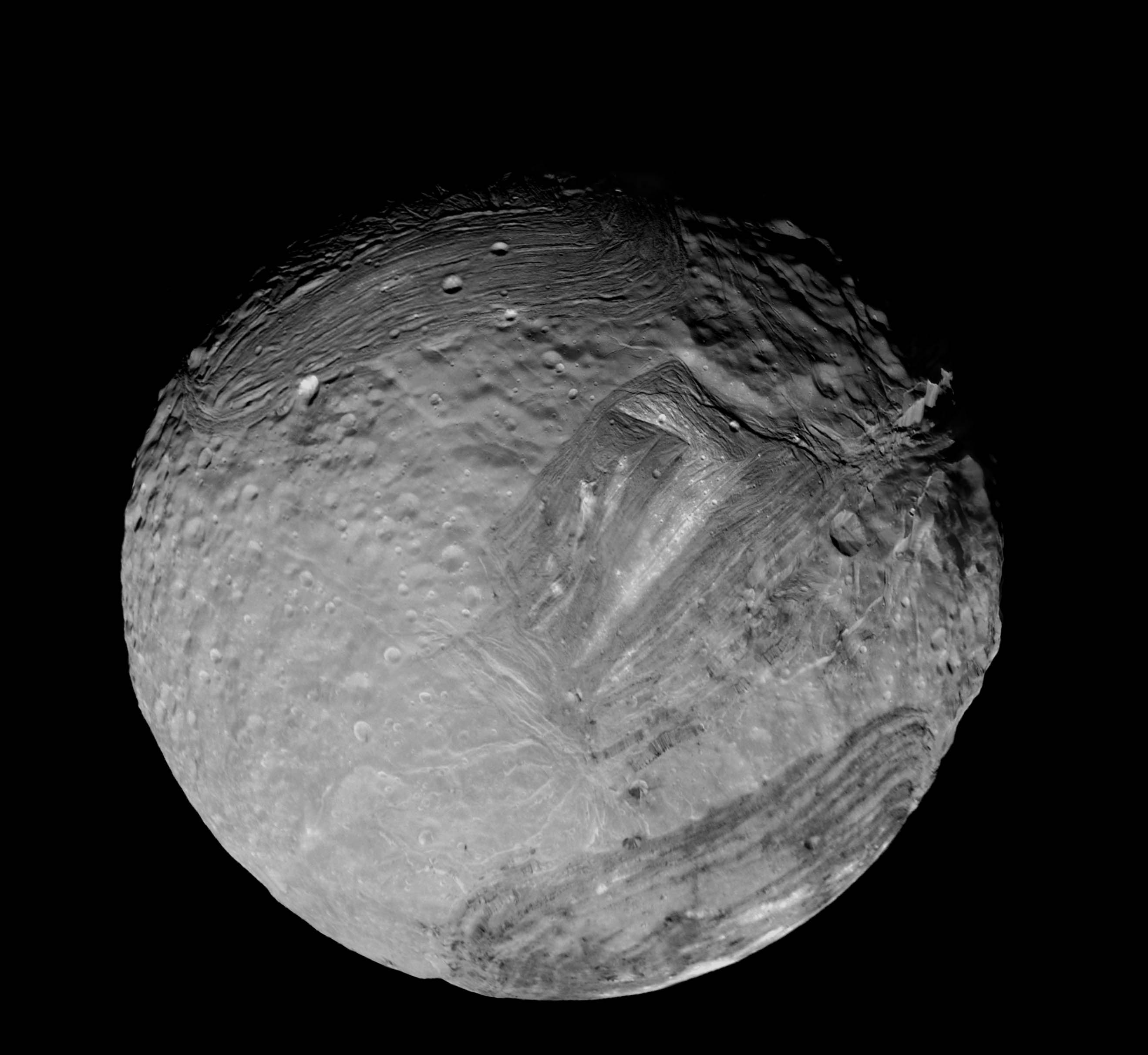 In the past week there have been 25th anniversaries of two events in 1986, one great, one terrible: the closest approach of Voyager 2 to Uranus on January 24, and the explosion of the space shuttle Challenger upon liftoff on January 28. It was just before my 11th birthday, and I was in the 6th grade. I don't recall whether I saw Uranus images in the news at the time. I of course saw them later, in my science books and on public television shows, and I've always been sort of fascinated by the least appreciated of the giant planets, and by how little we really got to see of its family of moons.
