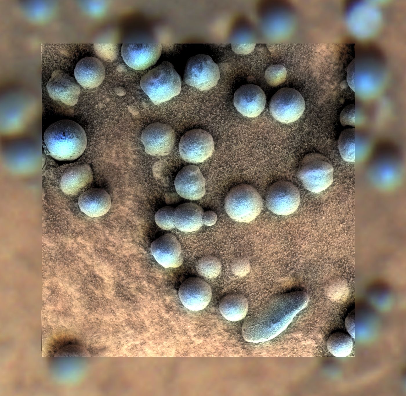 These images are at a resolution of 30 micrometers per pixel. The berries in the image above are between 3 and 4 millimeters across. Apart from their scientific interest, I find these pictures to be aesthetically beautiful and so different from most of the space images that we customarily look at, which are taken from so much farther away. Whenever I go out on a field trip and see an interesting rock, one of the first things I do is to put my nose right up to it and see what crystal shapes I can find, what colors they are, how they are put together. The Microscopic Imager lets us do that, but in black and white; adding in the Pancam color adds a whole new layer of verisimilitude to the experience of seeing these ultra-closeup shots from Mars.