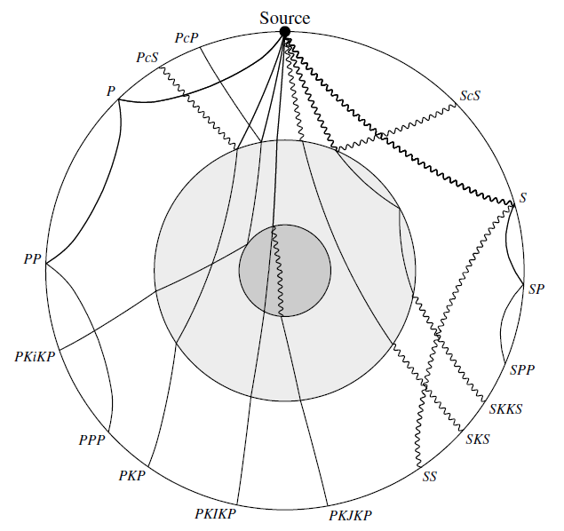 Global seismic ray paths and phase names. P-waves are shown as solid lines, S-waves as wiggly lines. The light, medium, and dark gray regions are the mantle, outer, and inner cores, respectively (the crust is invisibly thin at the scale of this diagram). Rays bend (refract) as they traverse Earth because seismic velocity increases with increasing pressure. At compositional boundaries, they may reflect or refract, remaining the same type of wave or converting from P to S or S to P. Shear waves cannot traverse liquids, so seismic waves only traverse the outer core as P-waves. Stations positioned in different locations on Earth's surface with respect to the earthquake epicenter will experience different families of seismic waves. From Peter Shearer's Introduction to Seismology (PDF).The reason I found this video fascinating is because it shows how the cracking and fissuring of a surface is an intensely local phenomenon that happens because of forces driven by global tectonics. When we study the patterns of cracks and fissures in the surfaces of icy moons like Europa, Ganymede, and Enceladus, we're seeing there the local results of global phenomena. How do you trace back from the zigzag pattern of a ground fissure to a whole moon's interior geology? It's a difficult problem.