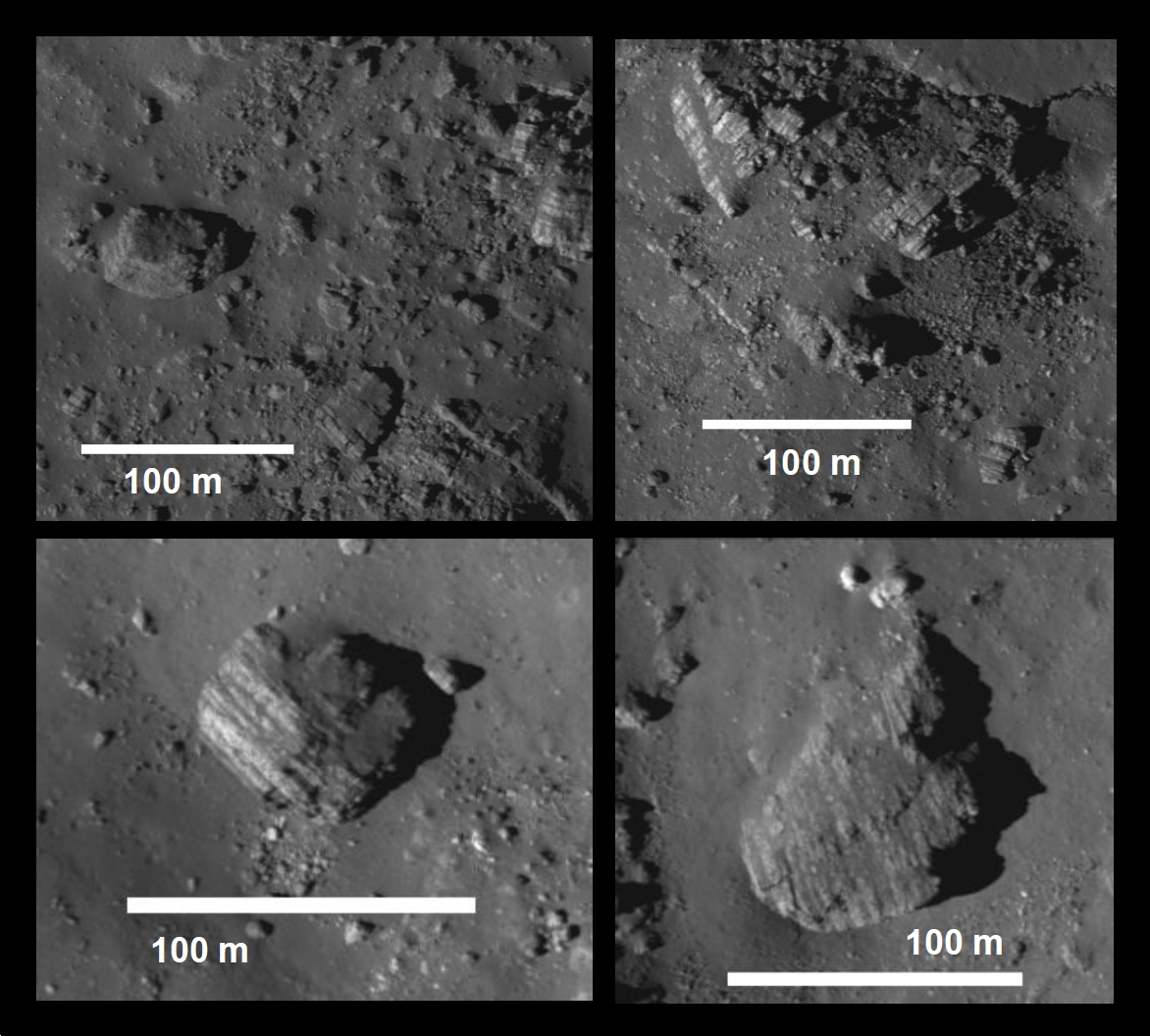 Contrast-enhanced images of layered lunar blocks from the Lunar Reconnaissance Orbiter Camera near Aristarchus Crater. Crops from LROC image M120161915LE.The layers in these blocks near Aristarchus seem to always consist of variably thick layers of bright white material alternating with regular thin layers of dark material. Looking at the image of the large blocks above, you can also see that the brighter material sticks out more along the edges of the rock; it is more resistant to lunar erosion compared to the dark material.