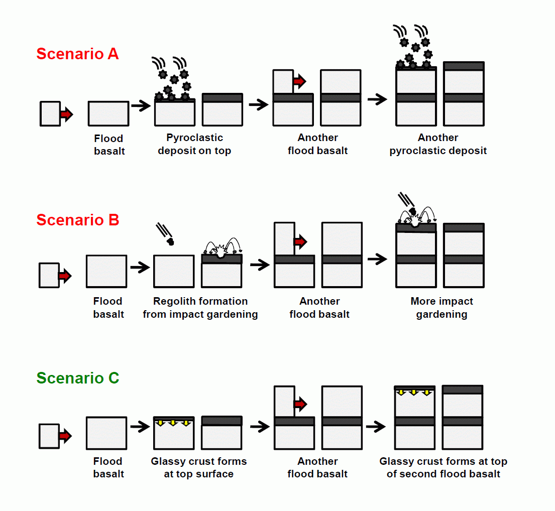 One possibility was that they formed when bright-material flood basalt deposits alternated with dark pyroclastic ejecta coughed out of volcanoes (Scenario A). [Pyroclastic rocks are composed of material that was blown out of volcanoes but solidified before it reached the ground as ash, cinders, lapilli, pumice, etc.] Another hypothesis was that the bright-material flood basalt deposits sat on the surface and were then peppered with impacts on the top side to make a dusty darker regolith (Scenario B). Yet another hypothesis was that bright-material flood basalts formed a dark glassy crust layer on the top surface as the basalt layer was quickly cooled when exposed to the lunar vacuum (Scenario C).
