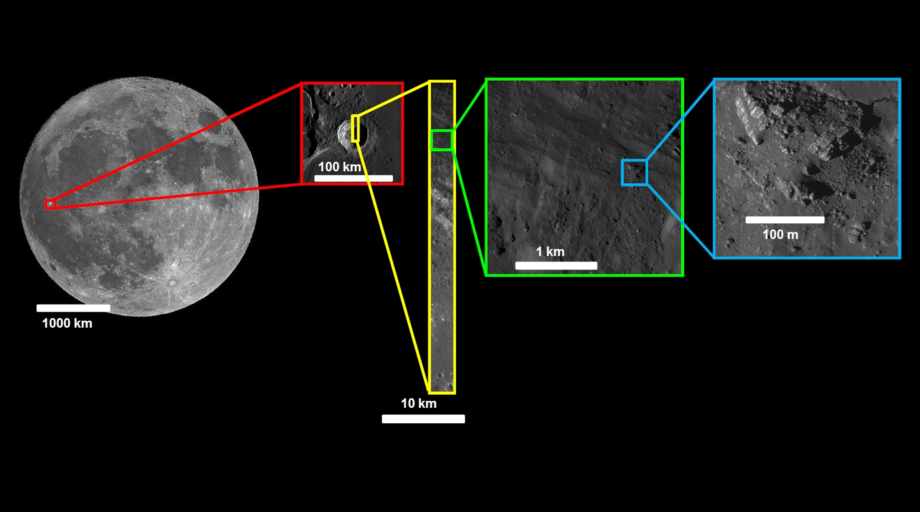 Images of layered blocks in Aristarchus Crater at varying image scales. Image credits: Full moon ("Supermoon") at perigee taken by Joseph Brimacombe on March 21, 2011. Other images from Wide Angle Camera (WAC) and Narrow Angle Camera (NAC) of Lunar Reconnaissance Orbiter: NASA / GSFC / ASU / Mike Zanetti. Illustration prepared by Mike Malaska.Layers are important because they are like pages in a geological story: each layer tells a chapter about how material was deposited on the surface. Put it all together in context and you can surmise the history of how that terrain came to be. Finding layered blocks in the ejecta of a large impact crater tells us that the pre-impact target terrain was layered. In the case of Aristarchus Crater, this layering was probably due to many flows of lava being emplaced one on top of another to make a layer stack of the different flood basalt events.