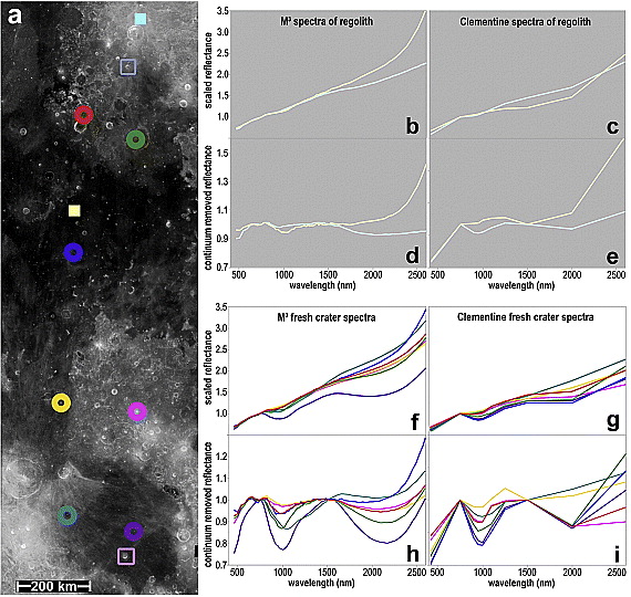 The article discusses two spectrometric data sets from two lunar orbiters. (This kind of data is referred to, dismissively or lovingly depending on what kind of scientist is talking about it, as "squiggly lines.") One data set is from the UV-VIS camera on Clementine, and the other is from the Moon Mineralogy Mapper (M3 or "M-cubed") on Chandrayaan-1. Both instruments mapped the Moon in wavelengths from visible to near-infrared, from a little over 400 nanometers to a little under 3 microns for both instruments. They had similar spatial resolutions, around 100-200 meters per pixel. The biggest obvious difference between the two instruments is spectral resolution -- that is, how many "slices" they cut the spectrum of light into. Clementine's UV-VIS was a camera with 11 filter wheels, so its spectra are graphs with only 11 points. M-cubed was a spectrometer that could split incoming light into 85 different slices, giving it a more detailed look at the colors of the Moon. Still, I would have expected the Clementine plots to be basically similar to the M-cubed plots.