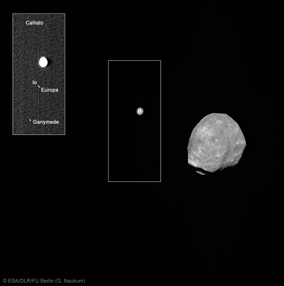 On June 1 2001, Mars express watched as Phobos (the inner and larger of Mars' two moons) slipped past distant Jupiter. Mars Express is studying Phobos to help the Russian Phobos-Grunt mission prepare to land on the moon and grab a sample for return to Earth. Phobos is only 23 kilometers in diameter, while Jupiter is 142,000 kilometers across! The inset image shows that the camera was sensitive enough to spot all four of Jupiter's moons as well, once the contrast was greatly enhanced.Blog Search