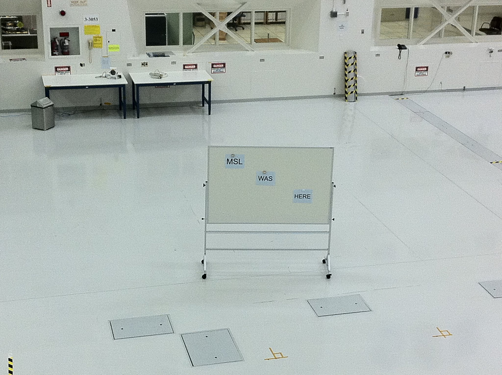 Meanwhile, Curiosity has left the building. This photo was taken in the public viewing gallery and posted to unmannedspaceflight.com this morning.