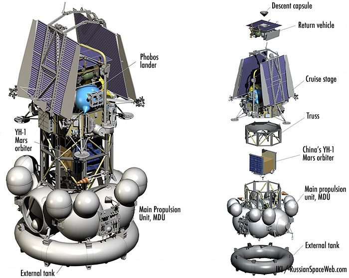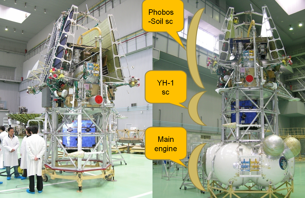 If you're ever looking for information on the status of a Russian mission, the place to go is Anatoly Zak's russianspaceweb.com. Browsing there this morning I was very happy to see that the Russian Phobos sample return mission, Phobos-Grunt, has passed a key milestone in its preparation for launch: it successfully completed its thermal vacuum testing in June. From the photos it appears that the Chinese Mars orbiter Yinghuo-1, which will hitch a ride on Phobos-Grunt to Mars orbit, then part ways with the Russian spacecraft, was stacked with Phobos-Grunt during this testing.