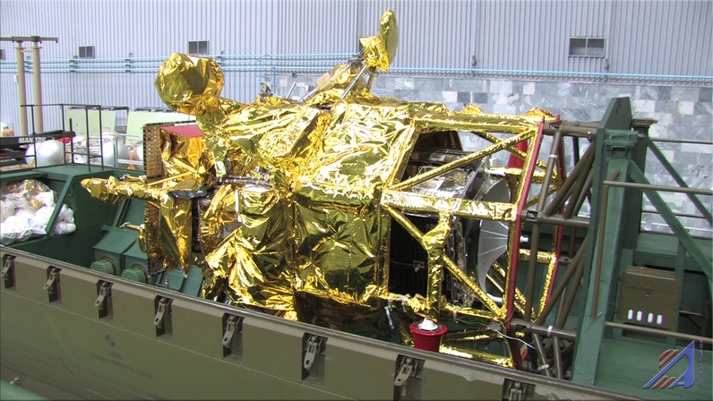 There are more pictures on Lavochkin's news page but for some reason the Cyrillic characters are not displaying properly for me on that page, so I can't run the text through Google Translate, so I can only guess what they show. Most of the photos on that page are of the Spektr-R space radio telescope, but a few are of Phobos-Grunt. I believe that the photo below, dated June 27, is a picture of Phobos-Grunt in its shipping container, having arrived at its assembly facility after thermal vacuum testing. Note that the Chinese Yinghuo-1 orbiter is stacked underneath Phobos-Grunt -- you can see its dish and solar panels. This differs from earlier concepts I've seen that show Yinghuo-1 stacked on top of Phobos-Grunt. Comparing it to the thermal vac photos, you can see the same octagonal frame, wrapped in thermal blanketing, stacked underneath the Phobos-Grunt landing legs; under that is presumably the rocket engine that will fire to insert Phobos-Grunt and Yinghuo-1 into Mars orbit.