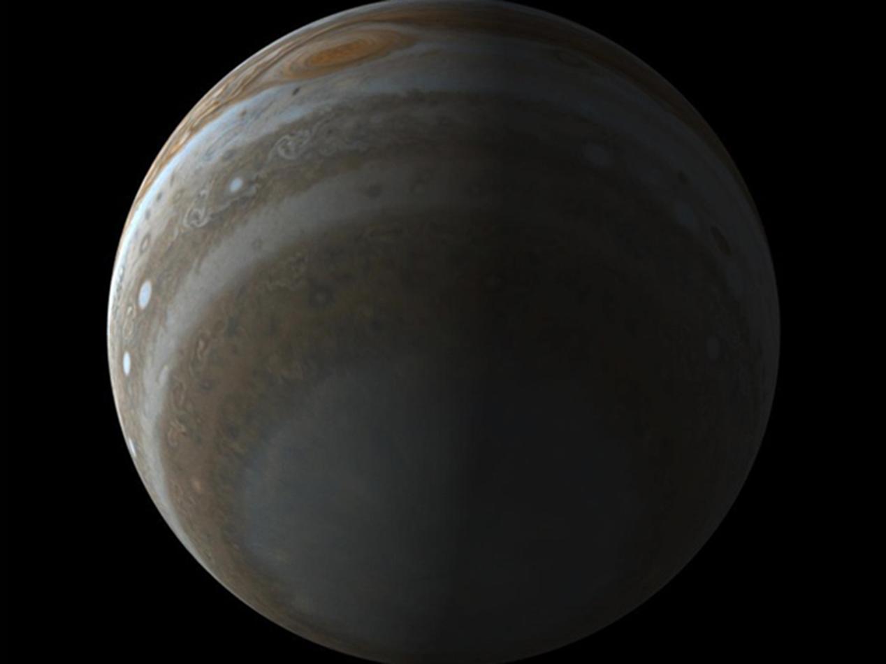 This simulated view of the south pole of Jupiter illustrates the unique perspective of the Juno mission. The spacecraft's polar orbit will allow Junocam to image Jupiter's clouds from a vantage point never accessed by other spacecraft. Junocam has a 58-degree-wide field of view encompassing the entire polar region. The view illustrated here simulates an image taken 40 minutes before Juno's closest approach to Jupiter. At closest approach, Junocam's images of Jupiter's cloud tops will have a resolution better than 5 kilometers per pixel.Junocam faces some significant challenges. Juno is a spin-stabilized spacecraft, and Junocam is mounted on one side, so as Junocam takes pictures it has to deal with both the spacecraft's motion around Jupiter and the spacecraft's rotation. The orbit is one that is not optimized for imaging; it is highly eccentric and goes from a perijove of about 5,000 kilometers to an apojove of 2.7 million kilometers over the course of its 11-day period. Most Junocam imaging will happen in the two or three hours around perijove, though they may make lower-resolution atmospheric movies at other times. When the spacecraft flies over the poles, the planet will roughly fill the Junocam field of view, and as the spacecraft gets closer to Jupiter the images will have higher resolution but lower areal coverage. The Juno orbit is roughly along the terminator, so about half of each image will be of the dark portion of the planet. It's possible that they will attempt searches for lightning, aurorae, rings, and other faint objects, but these details are still being discussed and the camera is not really designed for very dim targets. Here's a simulated view of what Juno will see from orbit:
