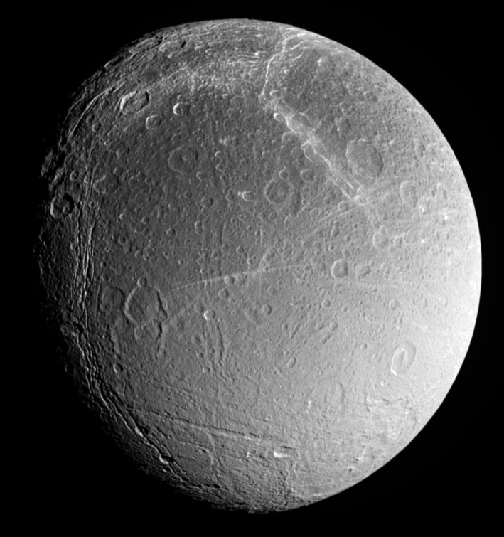 ![]() Dione's southern polar regions Fractures near Dione's south pole are more rounded and subdued than the ones farther to the north, indicating multiple generations of geologic activity on this moon. This view was captured by Cassini during a distant flyby on August 1, 2005. Credit: NASA / JPL / Space Science Institute |