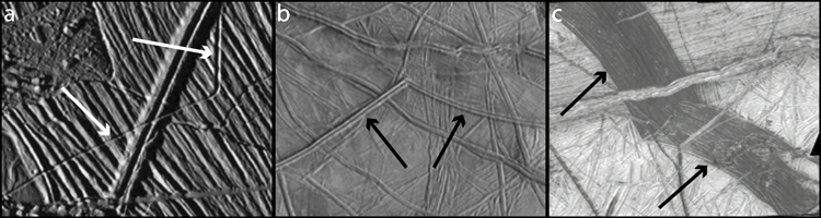 ![]() Examples of a trough, ridge, and band on Europa High resolution images of the highly fractured icy surface of Europa. These images were taken by the Galileo spacecraft. The above images highlight the three most common morphologies of cycloids on Europa (a) trough (b) ridge (c) band. Credit: NASA / JPL / Marshall and Kattenhorn |