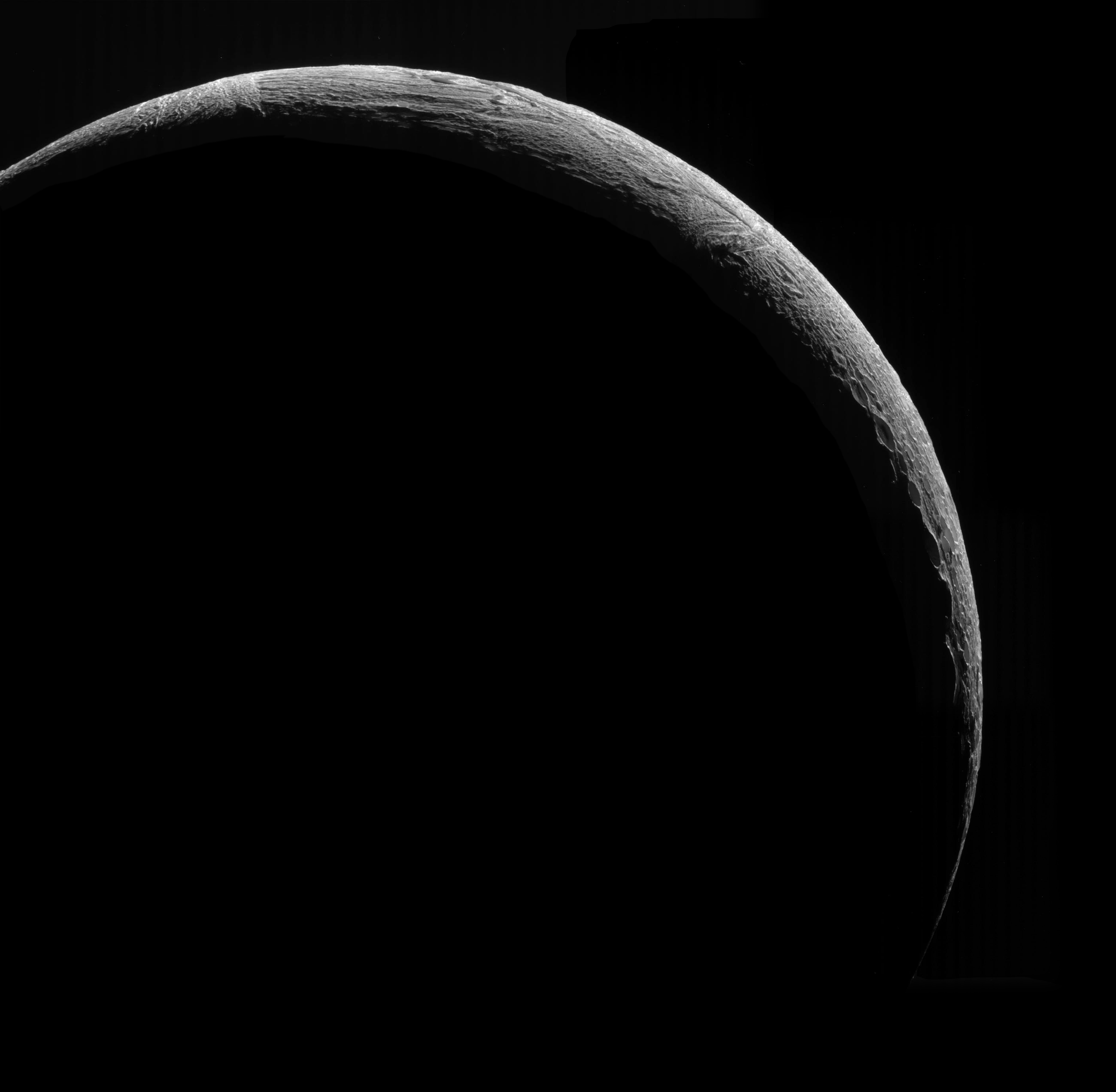 Next up, a really fine data set -- five footprints covering an incredibly skinny Enceladus crescent. This one you must enlarge to appreciate properly. The upper part of the crescent (actually the lower part of Enceladus -- south is to the left in this view) is a patchwork of parallel fractures, some sets going one way, others going a different way. Then you get down (up) to the northern end of the crescent and much more densely cratered terrain. The insides of the craters are brightly lit by light reflected off of the crater walls that we can't see, the ones that are facing the Sun.