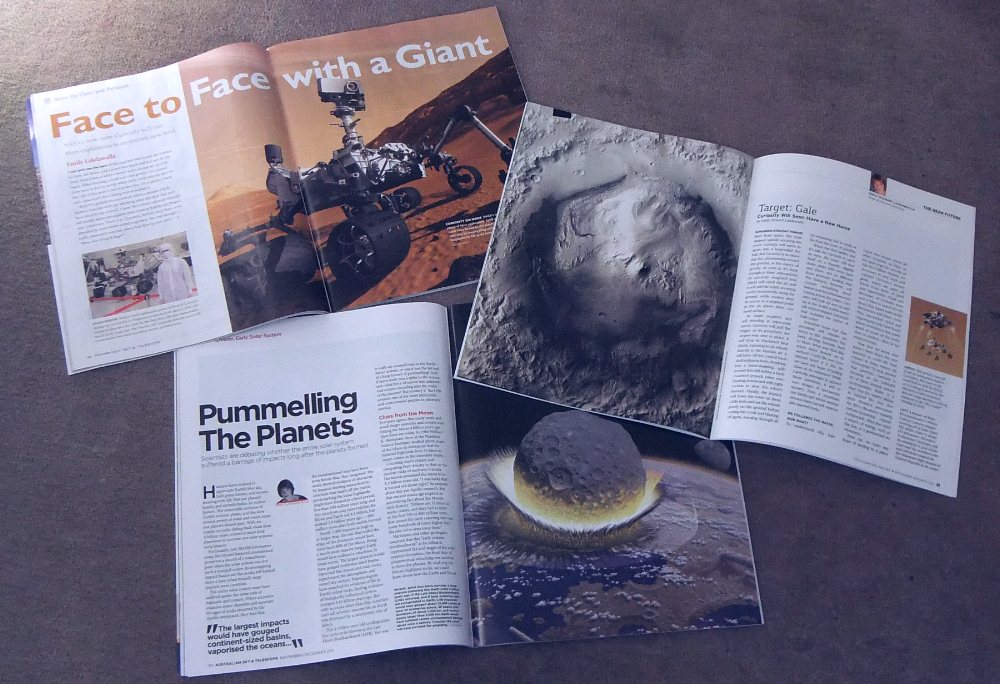 November has already been a very good month for me in the print publication realm. I've had published not one, but two, feature articles on Curiosity, the Mars Science Laboratory rover. The one I wrote first is in the December 2011 issue of Sky & Telescope, and the one I wrote second is in the "September Equinox" issue of The Planetary Report. Although there is of course some overlap between the two, I wrote them as complementary articles, so if you read and enjoy one, you should check out the other one too. Loosely speaking, the Sky & Tel one, "Face to Face with a Giant," focuses on the rover, while the Planetary Report one, "Target: Gale," focuses on its future home on Mars. (I wrote and submitted the first before Gale had been selected as the landing site.)