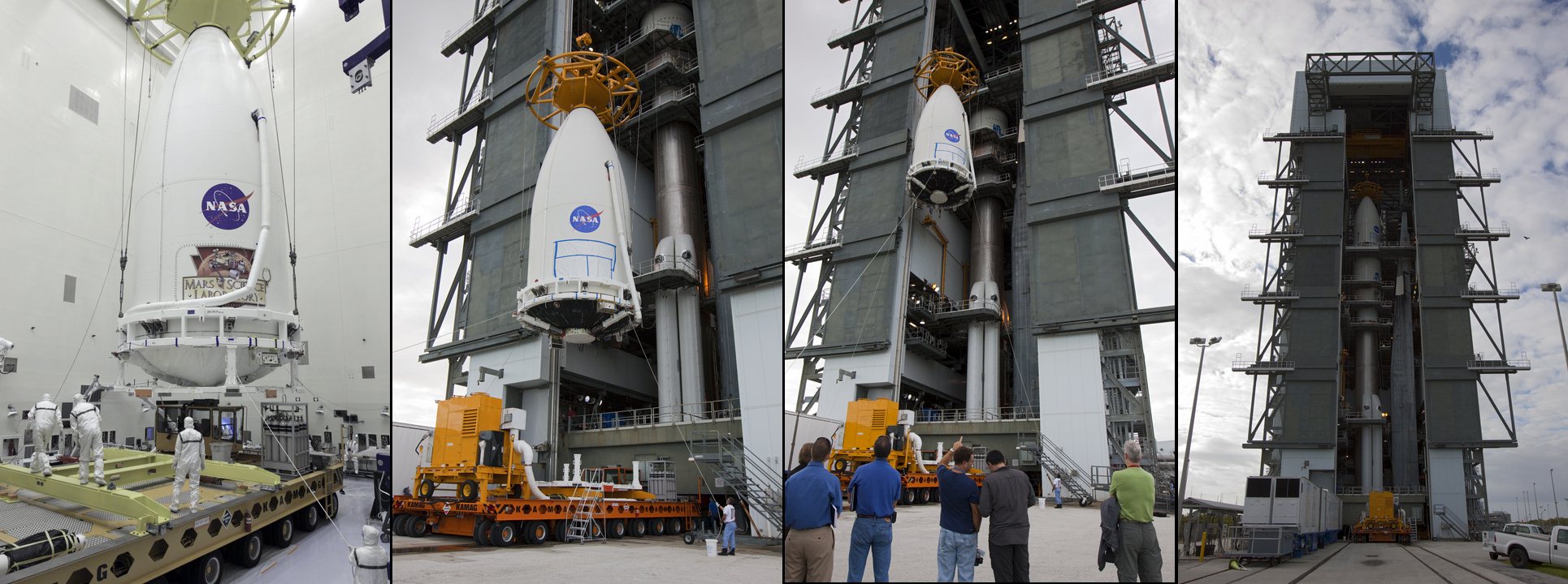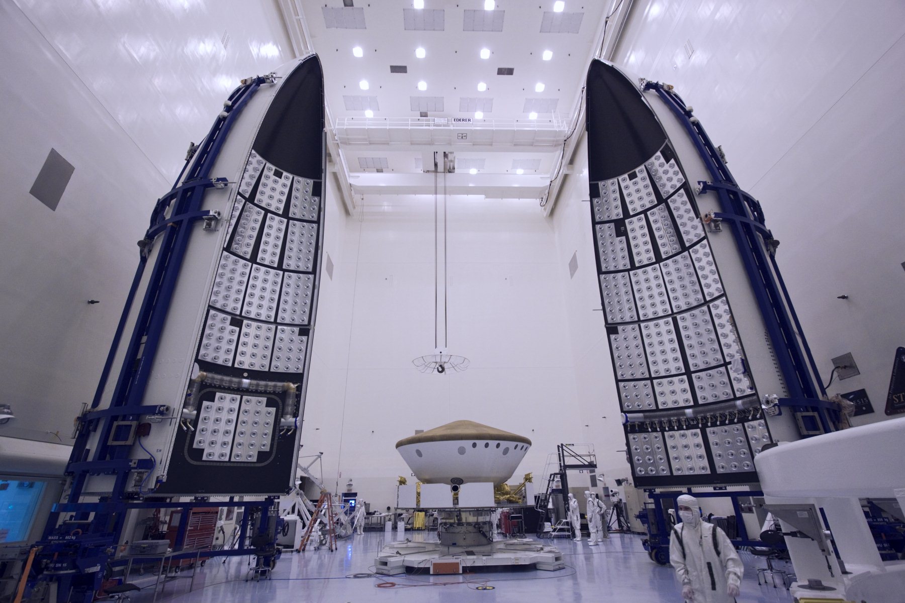 In the Payload Hazardous Servicing Facility at NASA's Kennedy Space Center in Florida on October 25, preparations are under way to enclose NASA's Mars Science Laboratory (MSL) in an Atlas V rocket payload fairing. The blocks on the interior of the fairing are components of the fairing acoustic protection (FAP) system, designed to protect the payload by dampening the sound created by the rocket during liftoff. The fairing will protect the spacecraft from the impact of aerodynamic pressure and heating during ascent.