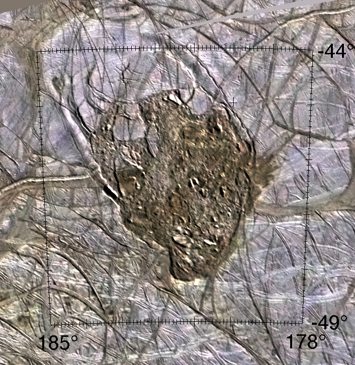 A view of Thera Macula on Europa, Plate Je13.4.2 from Paul Schenk's Atlas of the Galilean Satellites.ncounter: Galileo E17