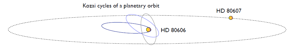 So, if the proto-planetary disk in which HD80606b formed was very inclined with respect to the orbital plane of the stars, the Kozai resonance is a natural explanation for '606b's monster eccentricity. Awesome!