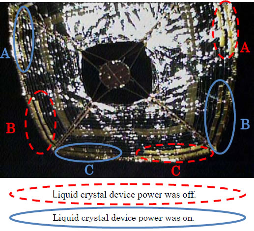 Embedded in the sail material are both solar cells for generating solar power and liquid crystal devices (LCD), which can be electrically turned on and off. When the power is on, the sunlight reflection is specular (as in the blue circle in the picture) and when off, the reflection is diffuse (in the red dotted circle). The diffuse reflection causes the area to look white while the specular reflection causes it to look dark. The different reflections create different forces and allow the sail to be turned in a controlled direction, using only sunlight. The team plans to synchronize the LCD on and off with sail spin during the attitude control experiment.