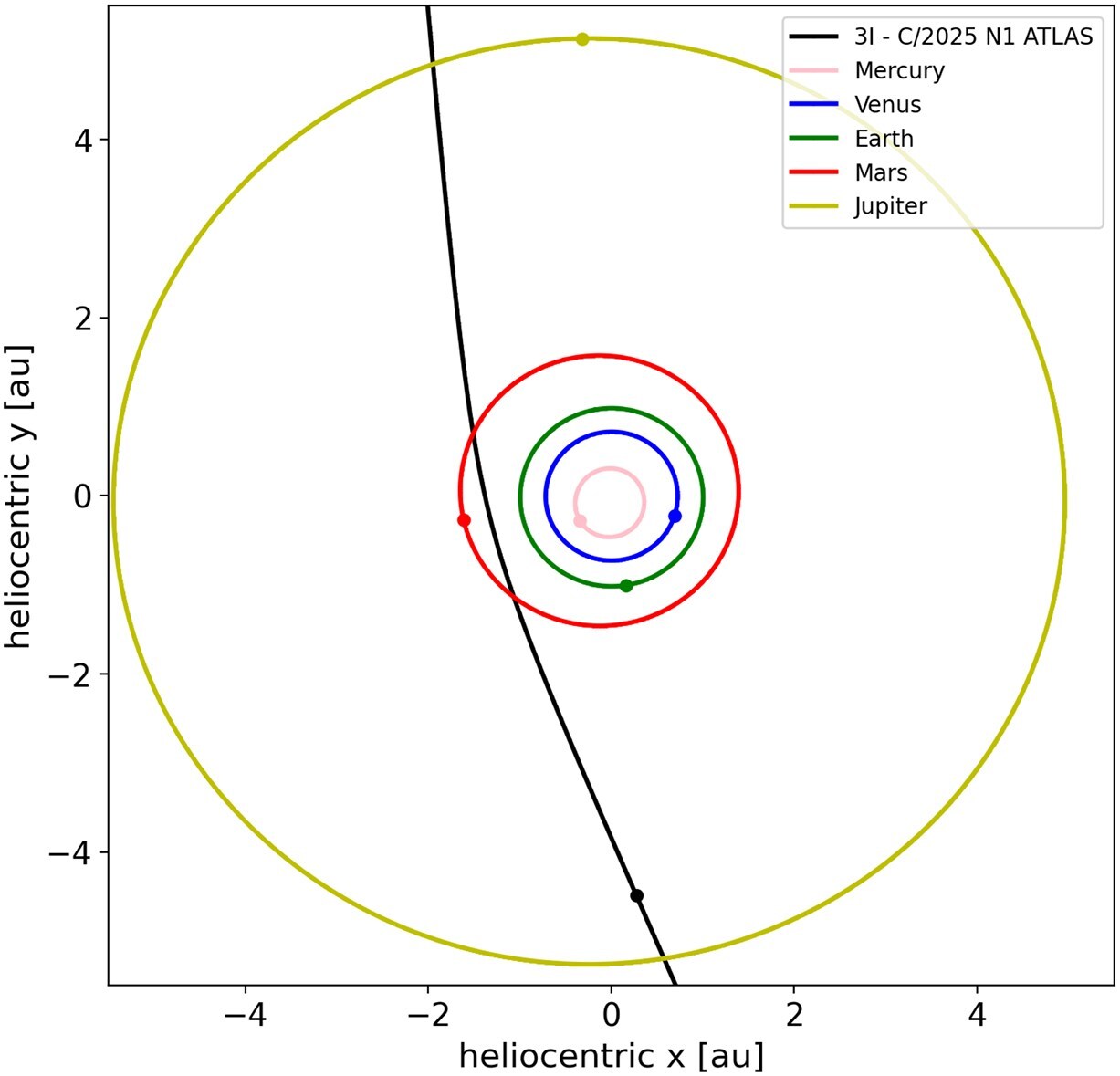 3I/ATLAS’s trajectory through our Solar System The orbit of interstellar comet 3I/ATLAS (black) compared to the inner planets of our Solar System at the time of its discovery on July 1, 2025. Planet positions are shown for Mercury (pink), Venus (blue), Earth (green), Mars (red), and Jupiter (khaki), based on data from NASA’s JPL HORIZONS system. View is from above the plane of the Solar System. Bolin, et al.