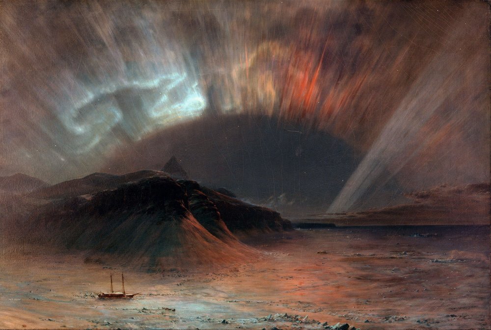 Aurora Borealis by Frederic Edwin Church The largest solar storm in recorded history was 1859’s Carrington Event, named after the astronomer who observed the solar flare behind it. The storm’s electromagnetic energy disrupted telegraph systems across Europe and North America, shocking operators and setting some stations on fire. Its power still inspires fear today, given our dependence on electronics. But the storm was also a spectacle, with brilliant auroras lighting much of the northern hemisphere. In 1865, American artist Frederic Edwin Church painted Aurora Borealis, perhaps inspired by the lights he saw in 1859. Image credit: Frederic Edwin Church. Frederic Edwin Church