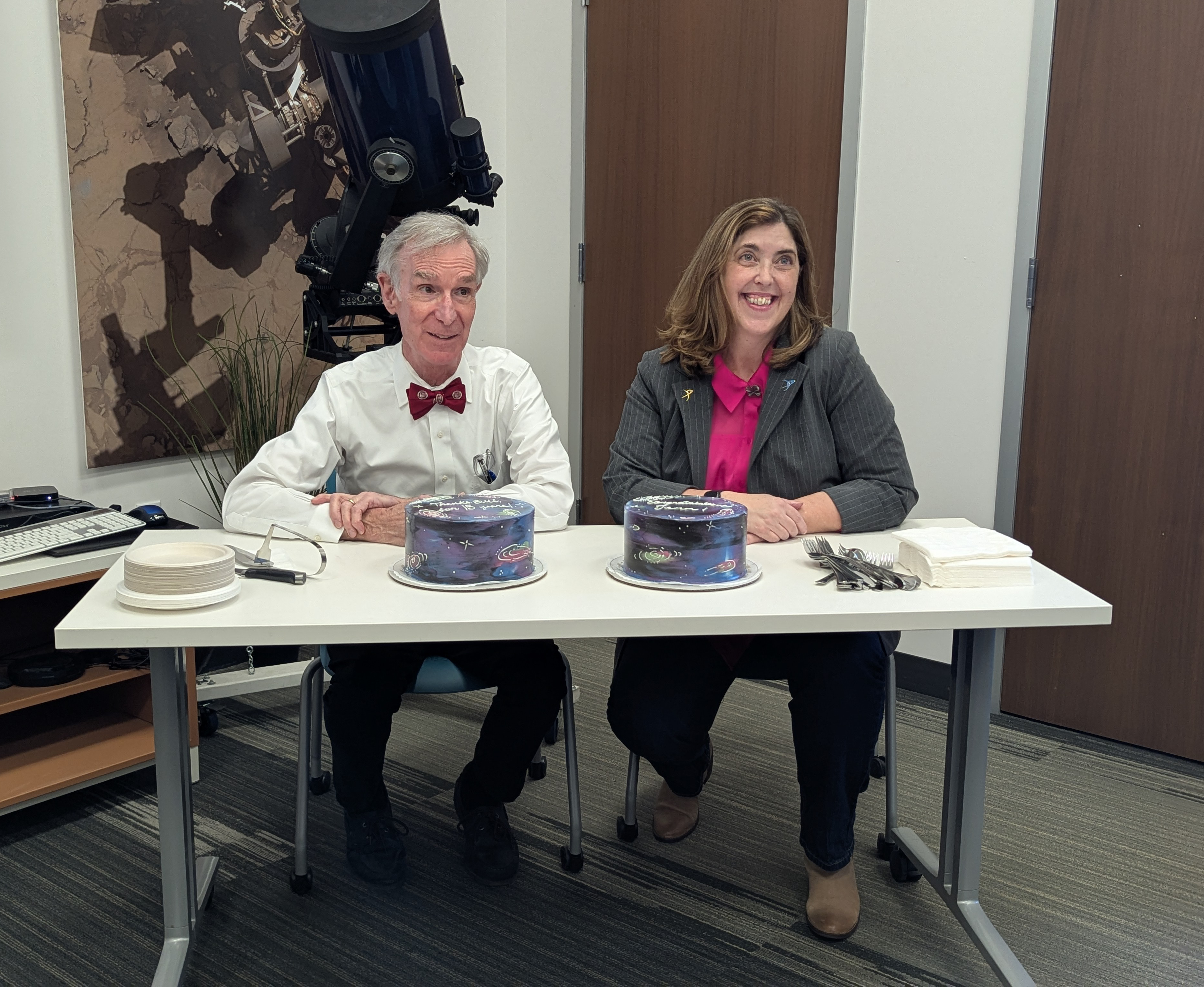 Bill Nye and Jennifer Vaughn with Transition Cakes Bill Nye and Jennifer Vaughn sit side by side at a table at The Planetary Society’s headquarters in Pasadena, smiling in front of two celebratory cakes marking the leadership transition. The cake on the left reads “Thanks Bill for 15 years!” and the cake on the right reads “Congratulations Jenn!” just before the cakes were cut and the celebration began. Sarah Al-Ahmed / The Planetary Society